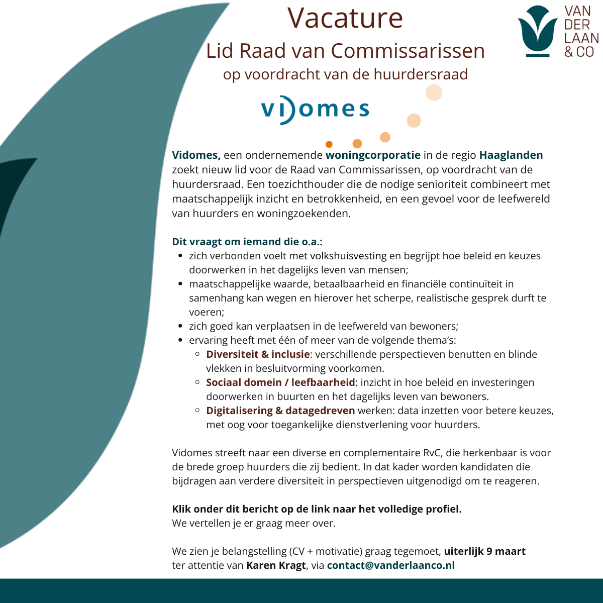 Voor Vidomes zoeken we een Lid Raad van Commissarissen op voordracht van de Huurdersraad. Het profiel kan hieronder worden vertrouwelijk worden gedownload.